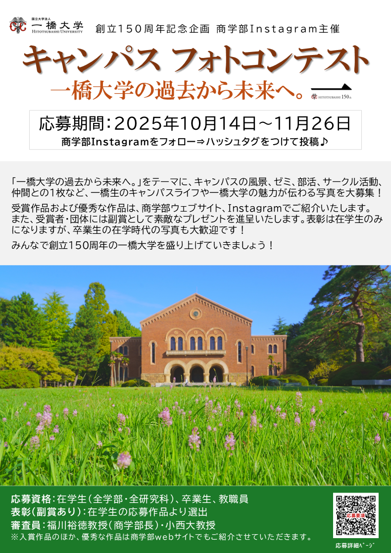 「一橋大学の過去から未来へ。」をテーマに、キャンパスの風景、ゼミ、部活、サークル活動、仲間との1枚など、一橋生のキャンパスライフや一橋大学の魅力が伝わる写真を大募集。受賞作品および優秀な作品は、商学部ウェブサイト、Instagramでご紹介いたします。また、受賞者・団体には副賞として素敵なプレゼントを進呈いたします。表彰は在学生のみになりますが、卒業生の在学時代の写真も大歓迎です!みんなで創立150周年の一橋大学を盛り上げていきましょう!